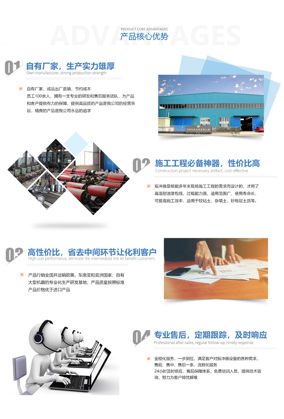 振沖器是振沖法施工中的特制機具。它產生水平向振動力振擠填料及周圍土體,而達到提高地基承載能力、減少沉降量、增加地基穩(wěn)定性、提高抗地震液化能力。 振沖法施工時除原地沖器外,尚需行走式起吊裝置,泵送輸水系統(tǒng),控制操作臺等。如工程單位缺乏起重機,本廠還供應振沖器施工樁架,樁架有單邊滾管立柱式、液壓步履式、簡易履帶式等。